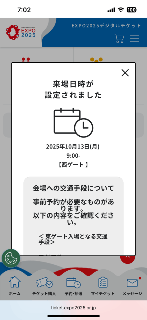 画像は最終日のチケットを2日前に予約できたときのものです。