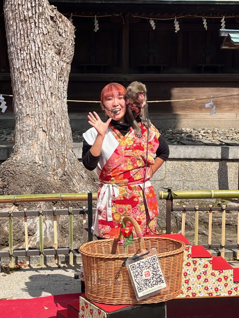 境内で猿回しのお姉さん。