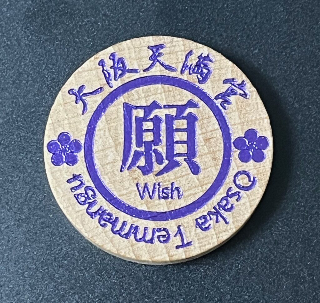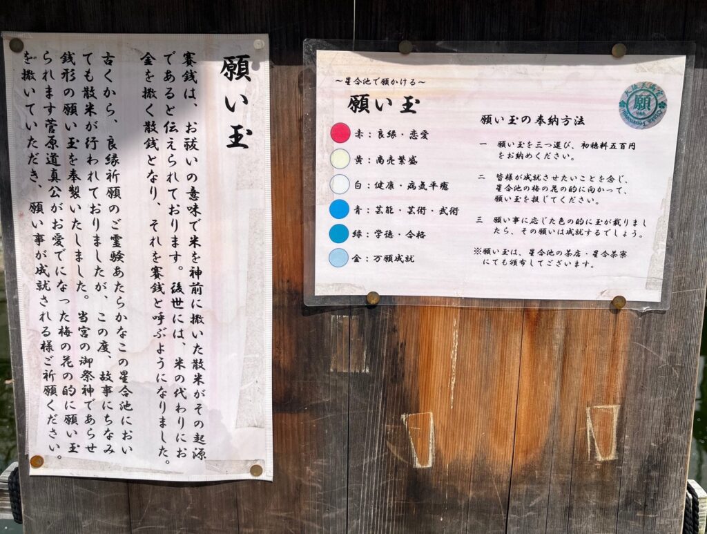 冒頭に書いた池です。境内の北側にあり、写真の右下に写っている花をあしらった浮遊の台に願い玉を乗せるというものです。何気なく投げてみたら、一投目で青色のところに乗りました。白色を狙った2投目は外れて、やっぱり無欲に行うのがええんやろなと思った次第です。祈祷してあるということなので1個は家に持ち帰りました。