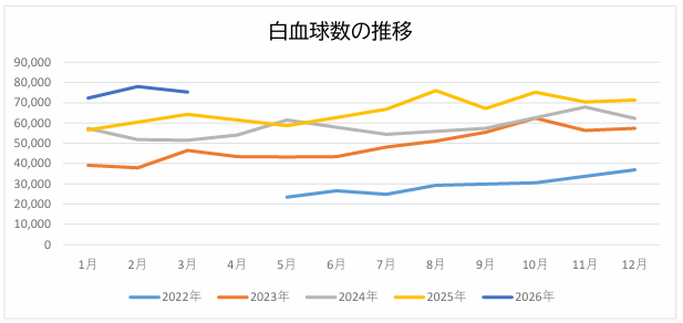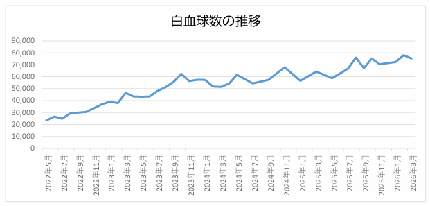 白血球数は75,200(10月)→70,400(11月)→72,300(12月)→75,000(人間ドック)→78,000(2月)→75,300とまあ横ばいでした。数値を見て担当医師は落ち着いていますね、というコメントでした。